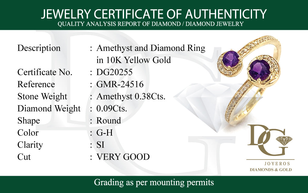Anillo de amatista con diamantes en oro amarillo 10kt.