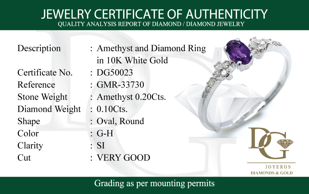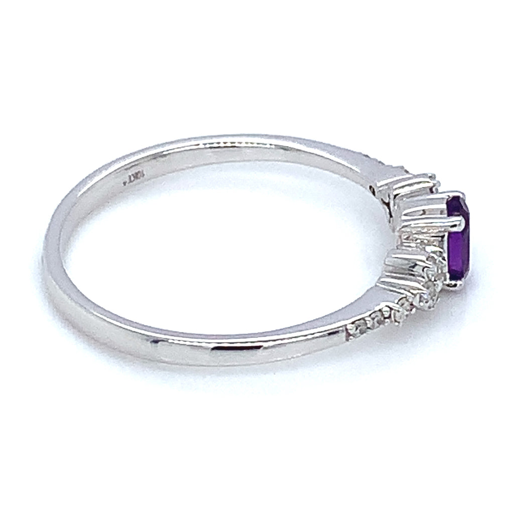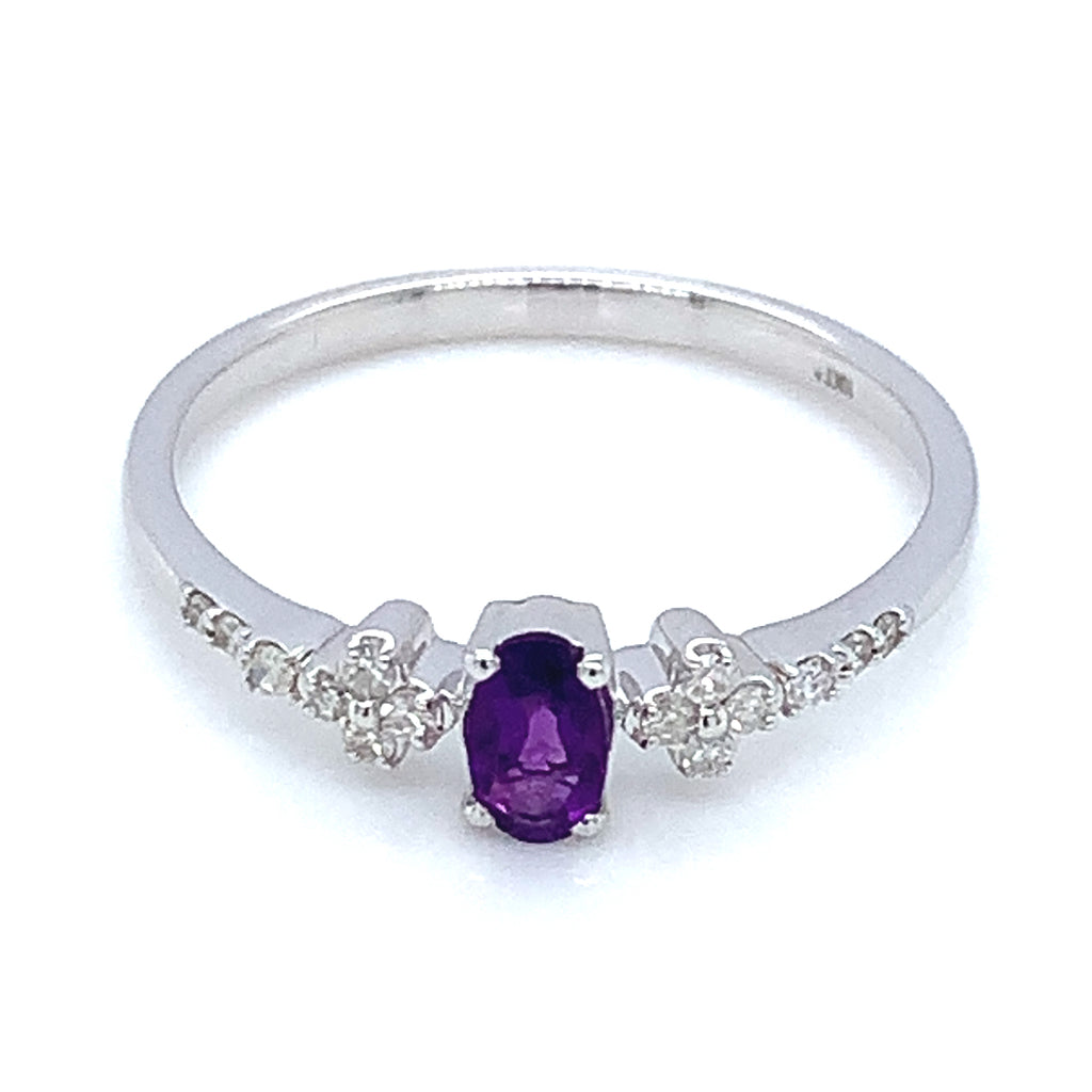 Anillo de amatista con diamantes en oro blanco 10kt.