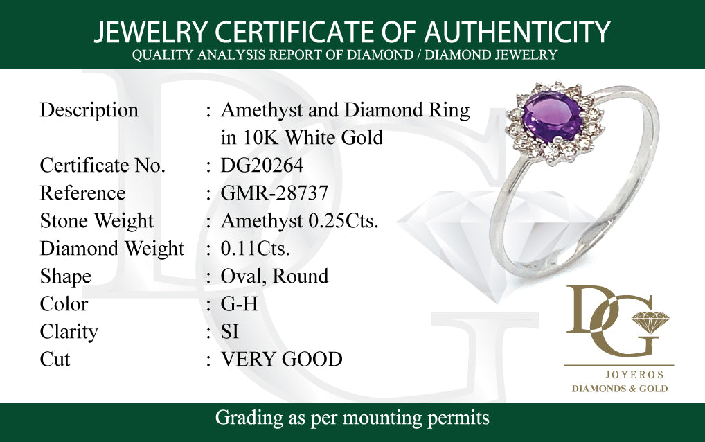 Anillo de amatista con diamantes en oro blanco 10kt.