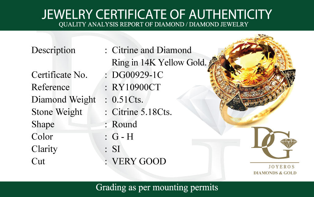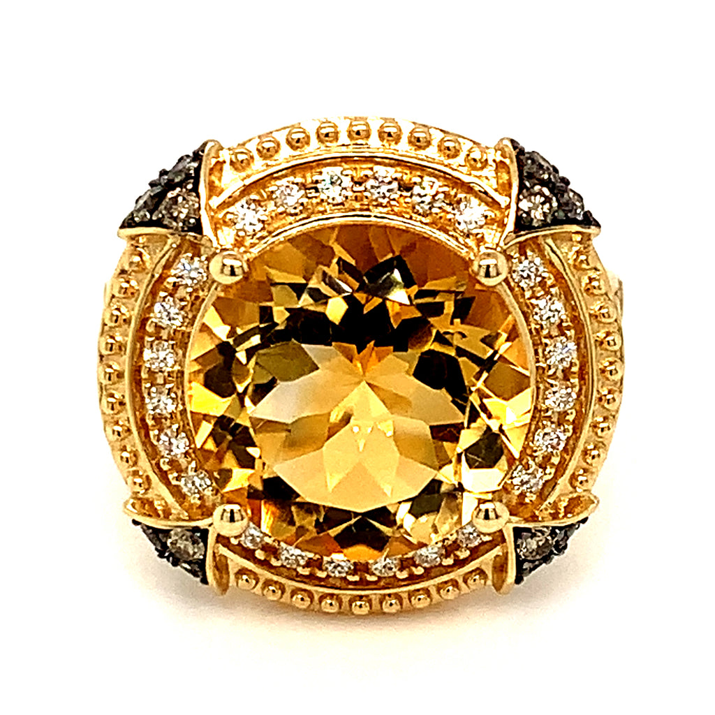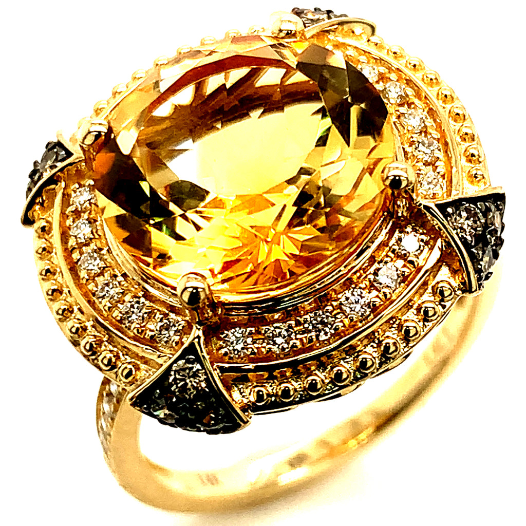 Anillo de citrino con diamantes en oro amarillo 14kt.