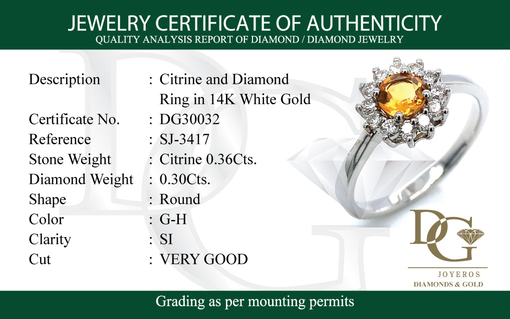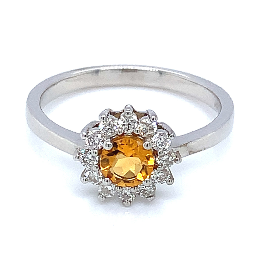 Anillo de citrino con diamantes en oro blanco 14kt.
