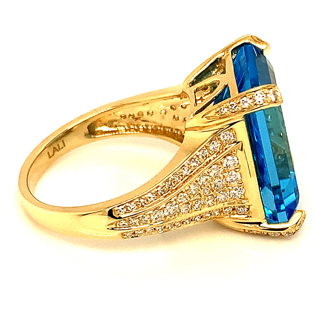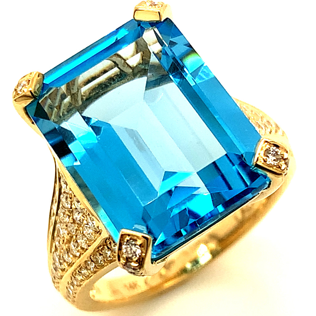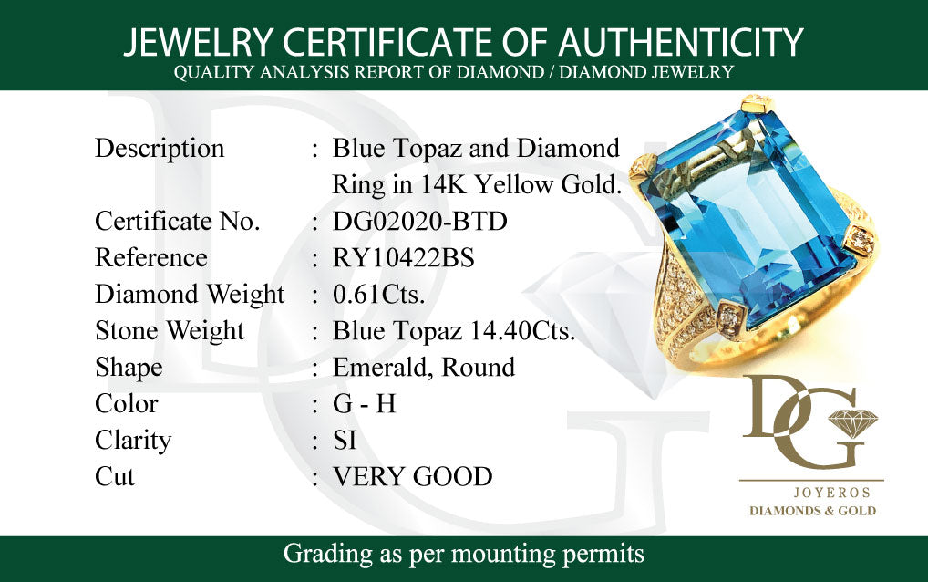 Anillo de topacio azul con diamantes en oro amarillo 14kt.