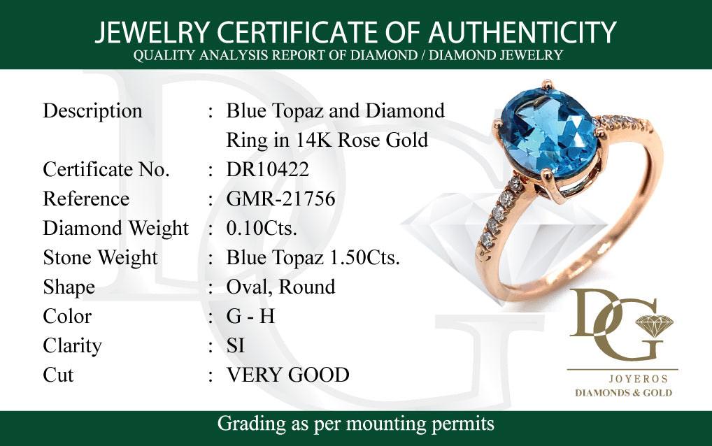 Anillo de topacio azul con diamantes en oro rosado 14k.