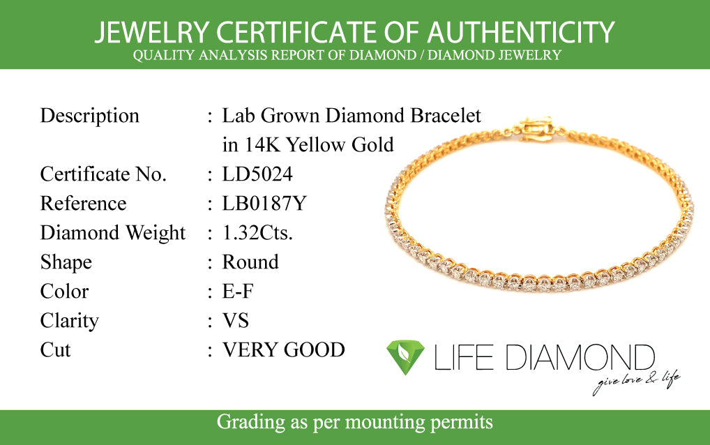 (LD) Pulsera (tennis) con diamantes de laboratorio en oro amarillo 14kt. D-1.32CT