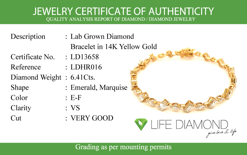 (LD) Pulsera (tennis) con diamantes de laboratorio en oro amarillo 14kt. D-6.41CT 19cm