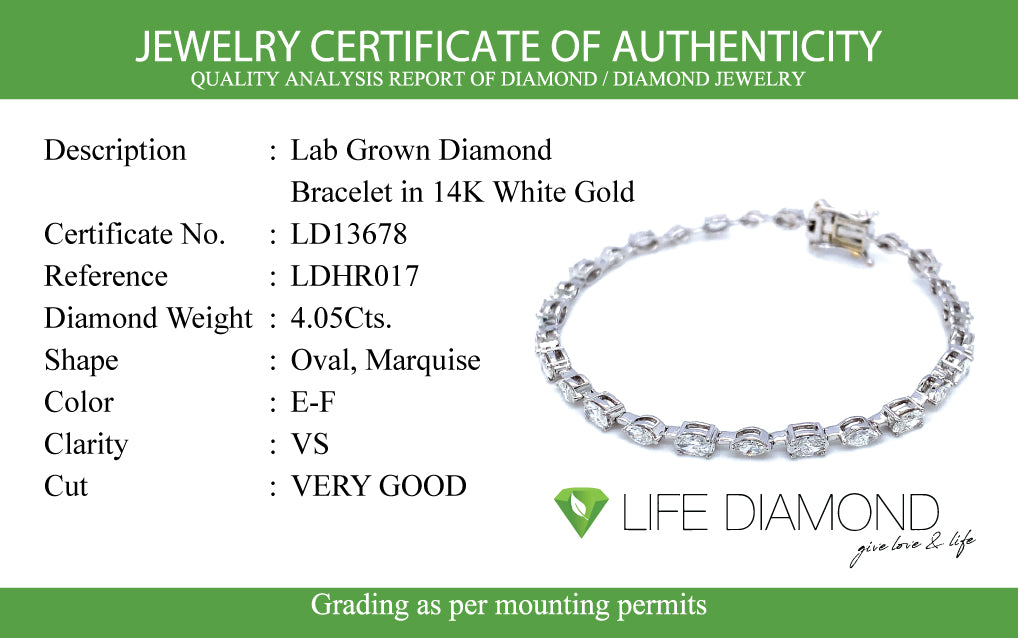 (LD) Pulsera (tennis) con diamantes de laboratorio en oro blanco 14kt. D-4.05CT 18cm